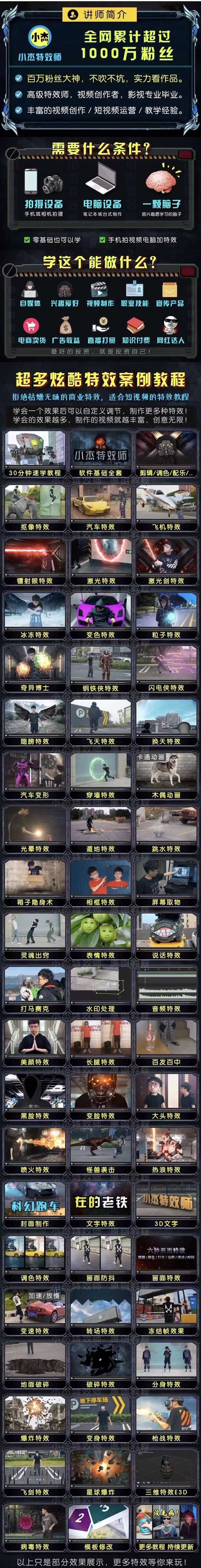 而且啊,这里面还有超多精彩的案例教程。像什么抠像特效、枪战特效、怪兽袭击特效,简直太酷了!还有奇异博士、闪电侠、钢铁侠这些超级英雄的特效,学完之后,你也能做出那种让人惊叹的大片效果。另外,像分身特效、隐身喷雾、屏幕取物这些创意特效,更是能让你的视频瞬间脱颖而出。