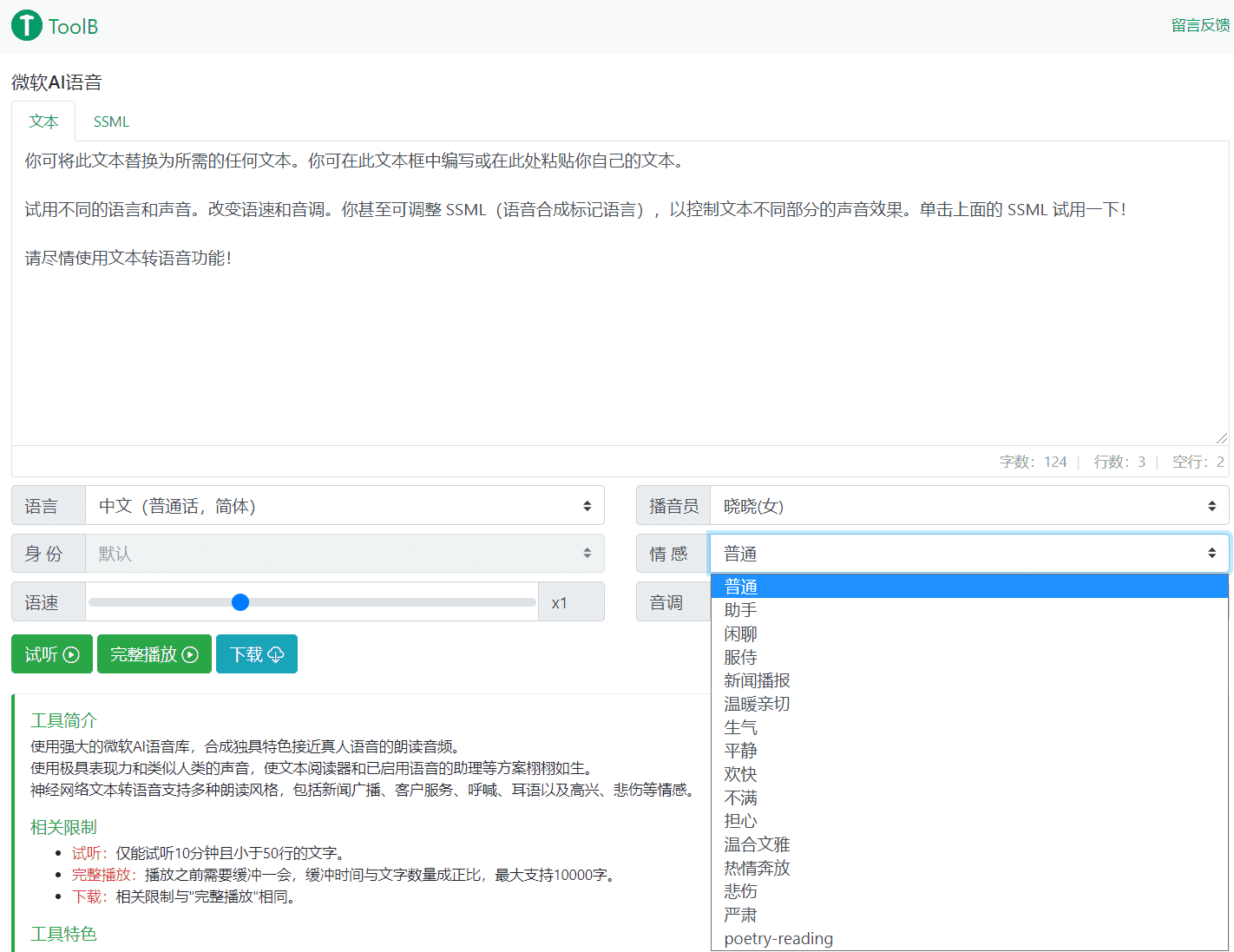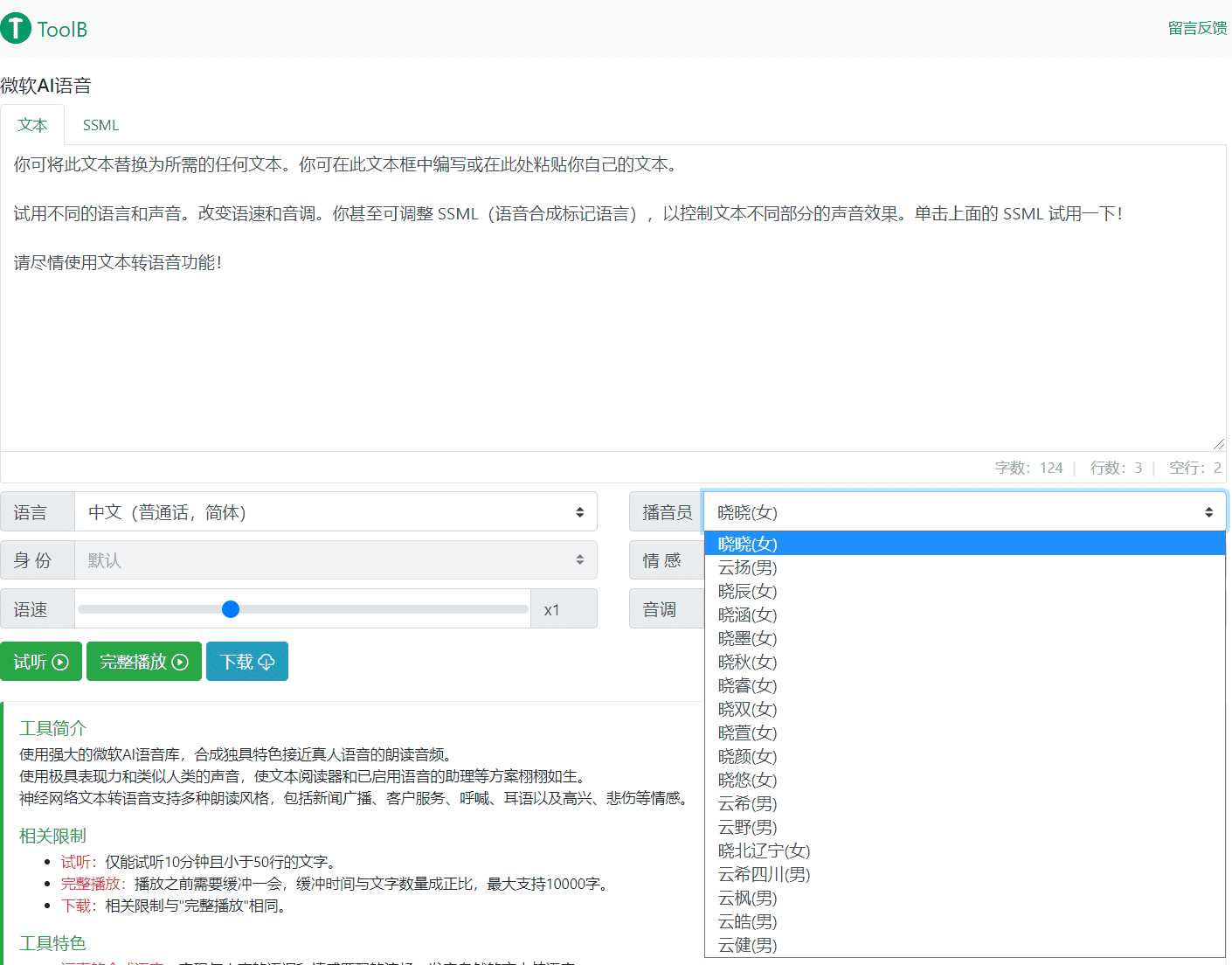 使用强大的微软AI语音库,合成独具特色接近真人语音的朗读音频。