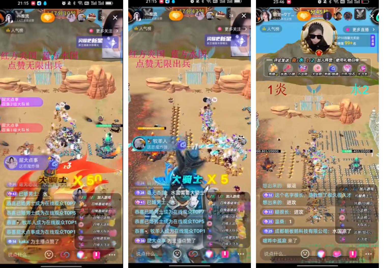 玩法规则也不难懂。观众输入【炎】【1】或【水】【2】就能自动生成基础军队,还能通过点赞、评论、礼物进行战前军队部署。用【进攻】【撤退】控制部队,实时操作消耗对方阵营兵力。游戏开始时,系统会随机分配炎国、水国为进攻防守方,在规定时间内,进攻方没攻下防守方,攻守方就转换;要是转换后攻方还没攻下,守方就胜利。不过要注意,目前先选沙漠地图,森林地图还在优化呢。主播可以根据直播间人数设置基地血量值和游戏时间,1 – 10人直播间,基地血量值2000,时间300s;10 – 50人直播间,基地血量值20000,时间600s;50人以上直播间,基地血量值50000,时间900s。游戏玩法还有策略,鸡腿手、执盾手、长矛手当前排进攻,后排大法师技能收割,羊骑士/狼骑士破阵,大龙场控。