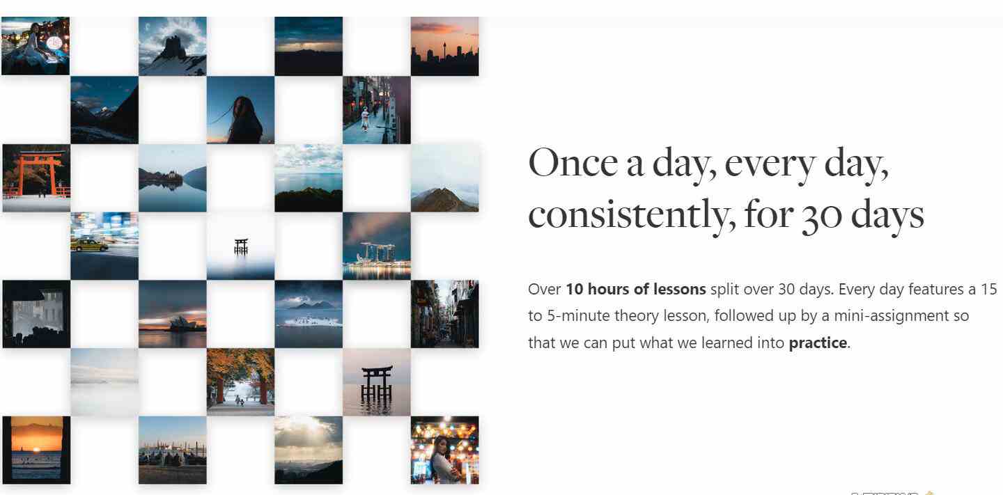 课程内容安排得超细致,30天一天不落。从第一天搞清楚“到底什么是摄影”,到后面依次学习传感器尺寸、镜头、曝光、对焦等知识,再到摄影艺术方面的构图、风格,还有摄影类型的介绍,像风景、街头摄影、肖像画等。课程后半段还会教编辑基础知识、Adobe Lightroom的编辑工作流程,以及摄影辅助主题,比如辅助装备、地点勘察和规划、备份和存储、分享作品、把摄影当成职业这些内容。而且教程是中英字幕的,学习起来更方便。