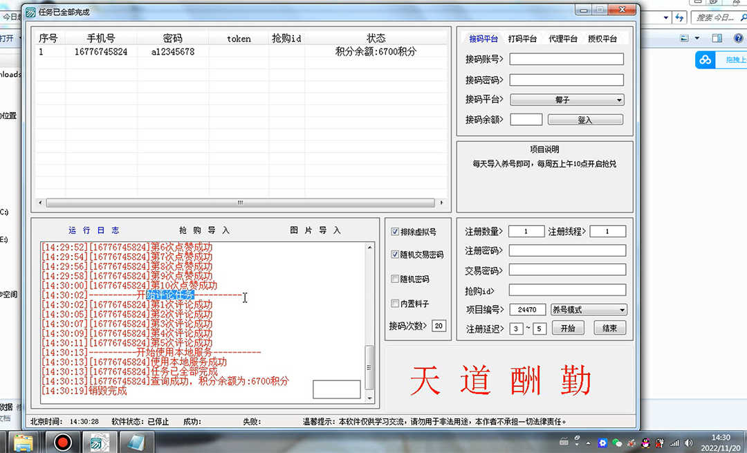 项目主要是通过用软件去自动签到任务去获得每日积分,每周五可以抢购30话费,基本就是无脑操作,登录上以后,一个号1-2分钟,挂机就完事了。脚本支持批量养号抢兑功能 ,多号操作抢购中奖概率更高