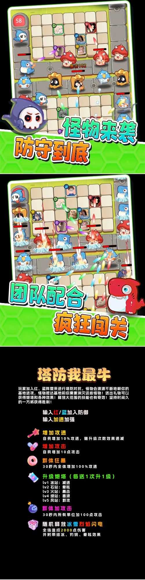 玩家加入红、蓝阵营来进行塔防对抗。怪物会源源不断地朝你的基地进攻,怪物抵达基地前你需要消灭这些怪物!送出礼物可以获得炮塔和各种效果!释放大范围的技能也有奇效!坚持时间久的一方将获得胜利!