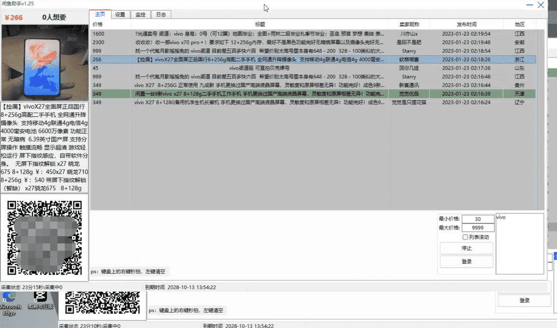 这软件可太牛了,它能实时在线自动采集闲鱼用户刚发布的商品。而且你还能自定义设置采集关键词,不管是手机、电器,还是闲鱼上能卖的其他啥商品,只要用户一发布,软件马上就能采集出来。想象一下,别人刚把心仪的宝贝挂到闲鱼上,你这边软件就采集到了,第一时间就能掌握信息。要是看到有自己喜欢的商品,直接用手机闲鱼 APP 扫软件左侧的商品二维码,就能去闲鱼里和商家详细了解商品情况,妥妥的捡漏小助手啊!