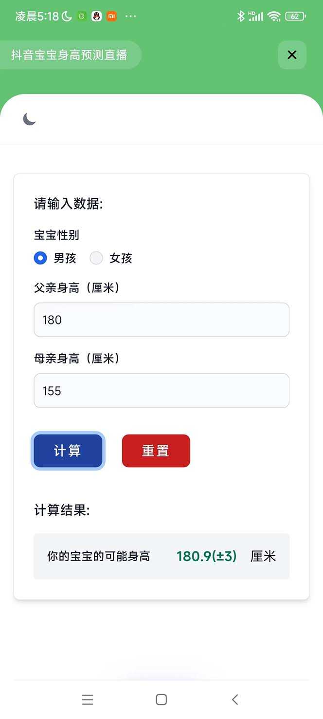 家人们,今天给大家分享个超牛的东西——5473期最新抖音宝宝身高预测工具!咱都知道,新手爸妈最关心啥?那肯定是宝宝未来的身高啊。这款软件专门就是给新手宝妈宝爸们预测宝宝未来身高的,而且还是在直播间用的工具。