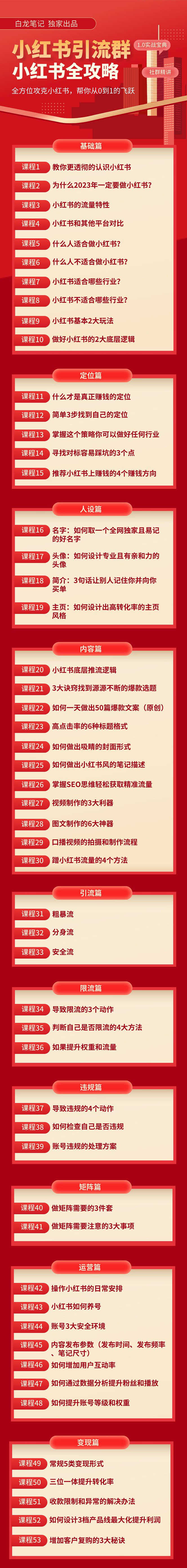 课程目录涵盖了基础、定位、人设、内容、引流、限流、违规、矩阵、运营、变现等各个方面,还有图文版教程和看前必读文档。这一套学下来,还怕搞不定小红书流量吗?