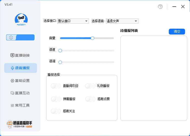 1.语音播报:礼物答谢、用户关注、加粉丝团、进直播间,评论弹幕五种数据的自动语音播报,可自定义语速、音调、播报人、频率等播报参数。