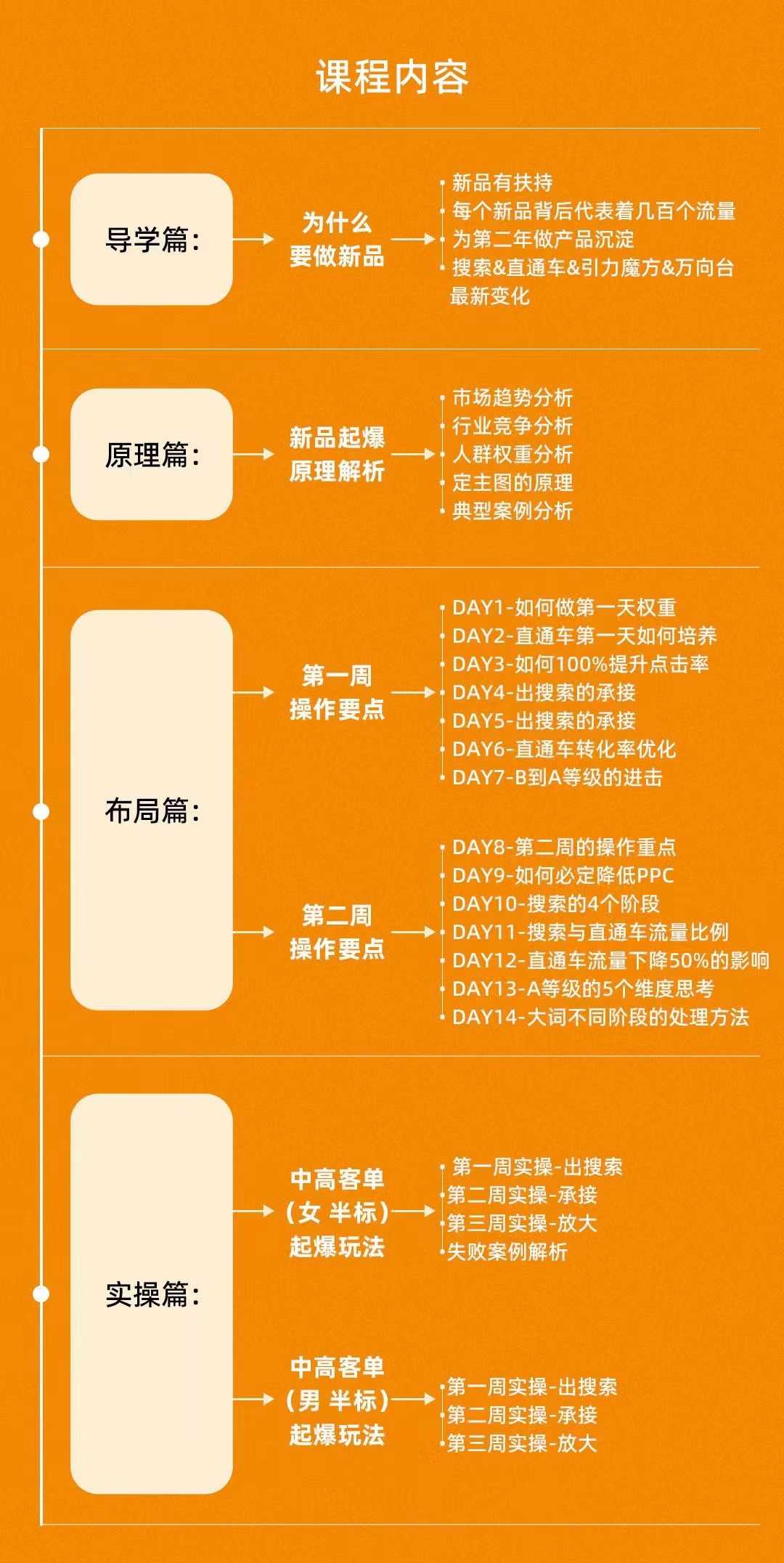 课程内容那叫一个丰富,从导学课开始,带你一步步了解新品打爆的流程。像直通车起爆部分,有市场分析、竞争分析、人群分析,还有定主图、做转化等实操内容,每天的实操课程都有,让你从第1天到第14天,都能跟着一步步操作。搜索起爆部分也很详细,针对中高客单的男女半标产品,从第一周出搜索,到第二周承接,再到第三周放大,还有失败案例解析,让你少走弯路。