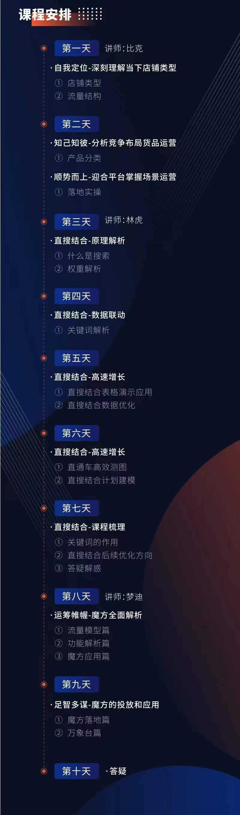 而且,授课的是3位一线讲师,通过三维一体的教学方式,全面提升你的运营能力。课程采用10天线上直播的形式,还有课后答疑,有啥问题都能随时解决。课程内容涵盖免费流量、直搜结合、魔方等,是最新最全的系列课程。学完之后,你就能全方位掌握淘系运营的方法和技巧,有效提升店铺数据。