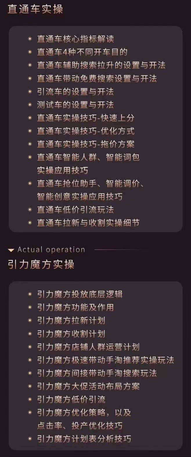 课程里有直通车和引力魔方两大板块的详细讲解。直通车部分,从核心指标解读开始,让你搞清楚每个数据背后的含义,无论是不同的开车目的,像辅助搜索拉升、带动免费搜索、引流、测试等,都有专门的设置与开法教学。还有实操技巧,快速上分、优化方式、拖价技巧等,一个个实用技能让你在直通车操作上如鱼得水。智能人群、智能词包以及抢位助手、智能调价、智能创意这些实操应用技巧也都涵盖其中,更有低价引流玩法、拉新与收割操作细节等内容,让你在直通车的战场上游刃有余。