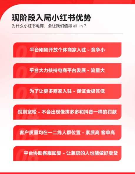 为啥说小红书电商是风口项目呢?你问问身边人,好多人都不知道小红书能开店卖货,就连做抖音电商的都不清楚。2023年以来,小红书商业化动作不断,又是上线团购功能,又是推出“笔记带货”功能,扶持力度变大,入驻门槛还降低了。现在干这行的人少,可不就是风口嘛!