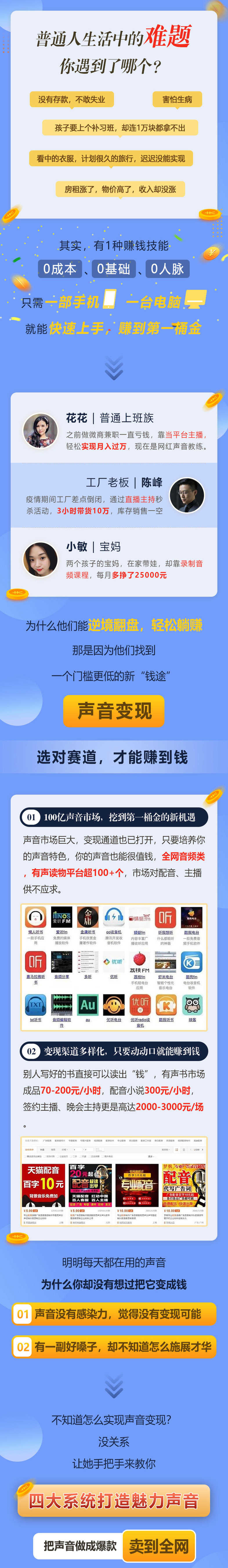 你要是觉得自己没基础,那完全不用担心,这课0基础也能轻松上手,实操性超强。课程内容那叫一个全面,从声音美化到沟通表达,再到变现赚钱,全方位、系统化地教你,就等着让你华丽转“声”!