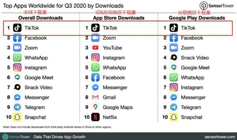 据数据显示,直至2020年第三季度,Tik Tok的下载量已达全球第一的位置,打败了Facebook和Google海外两大巨头的旗下应用。