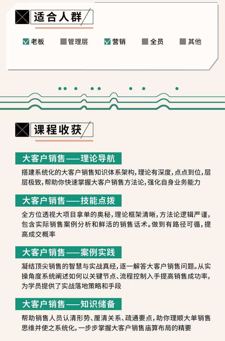 现在很多销售课程就是“只教套路,不教思路”,但这套资源完全避开了这个陷阱,它会普及大单销售的常识,专门训练咱们大客户销售的思维。就好比给咱们大脑装了个销售“导航系统”,让咱们在销售的路上不迷路。