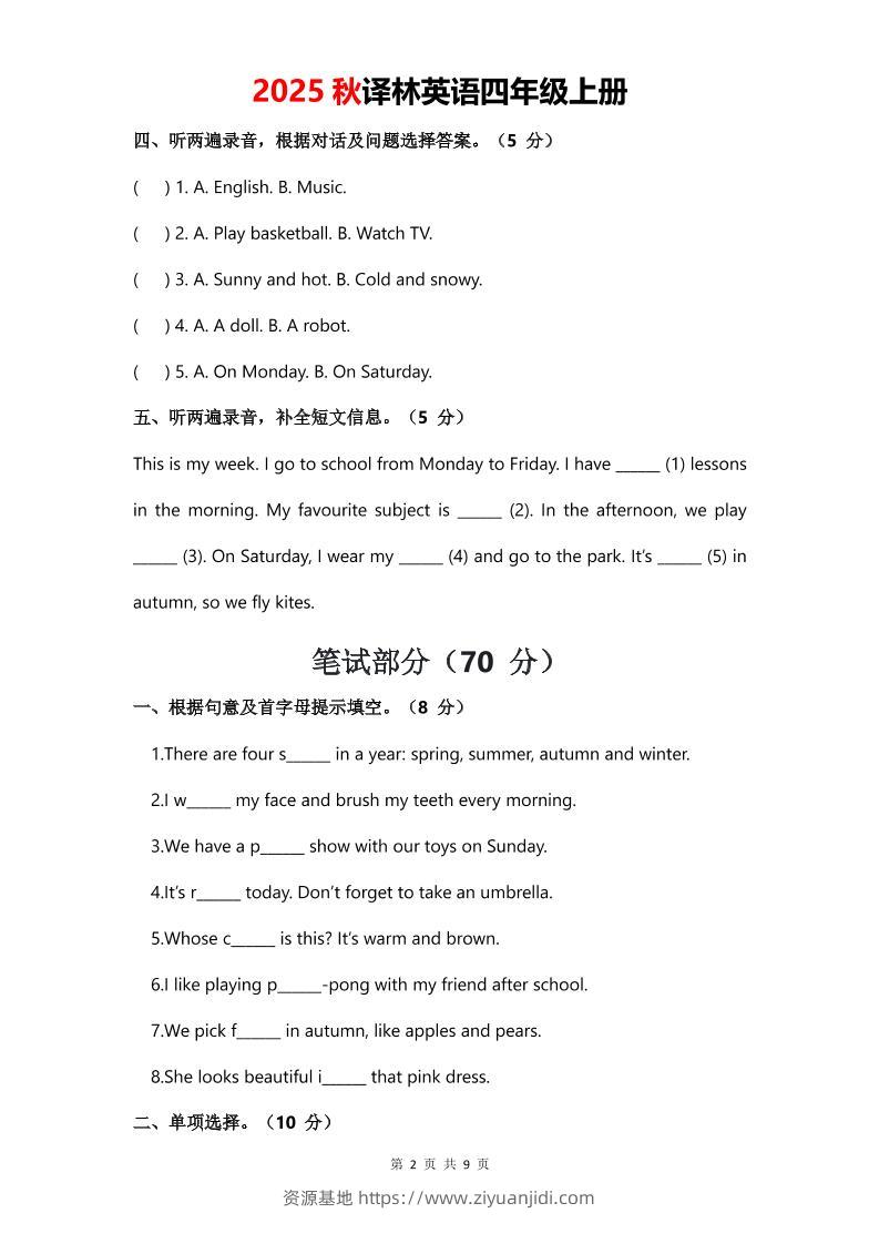 2025年秋译林版四上英语期末测试卷(无音频)子渊8个月前发布关注私信02915 ——预览已结束,还剩7页未读——开通会员后可免费下载高清完整文档 2025年秋译林版四上英语期末测试卷(无音频)此内容为付费资源,请付费后查看¥19.9¥999普通会员免费超级会员免费立即购买您当前未登录!建议登陆后购买,可保存购买订单格式pdf页数9 页大小254.58 KB付费资源© 版权声明文章版权归作者所有,未经允许请勿转载。THE END小学英语 喜欢就支持一下吧点赞15 分享QQ空间微博QQ好友海报分享复制链接收藏
