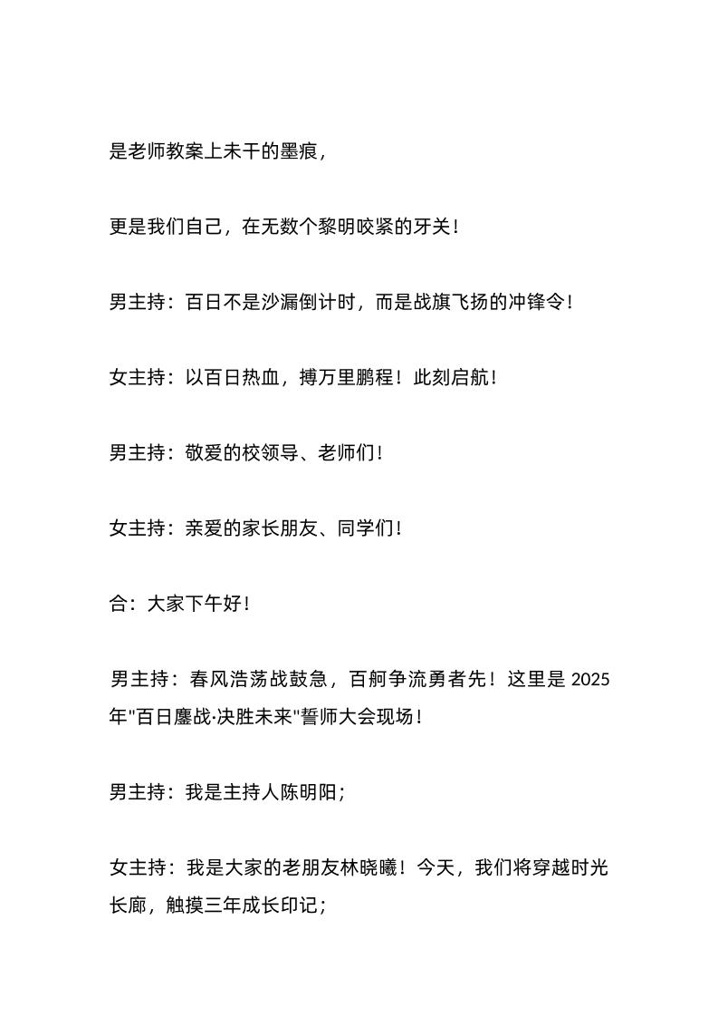 2025年中高考百日誓师大会活动主持词:百日鏖战酬壮志青春逐梦向未来子渊12个月前发布关注私信04213 ——预览已结束,还剩5页未读——开通会员后可免费下载高清完整文档 2025年中高考百日誓师大会活动主持词:百日鏖战酬壮志青春逐梦向未来此内容为付费资源,请付费后查看¥19.9¥999普通会员免费超级会员免费立即购买您当前未登录!建议登陆后购买,可保存购买订单格式docx页数7 页大小14.82 KB付费资源© 版权声明文章版权归作者所有,未经允许请勿转载。THE END发言稿 喜欢就支持一下吧点赞13 分享QQ空间微博QQ好友海报分享复制链接收藏