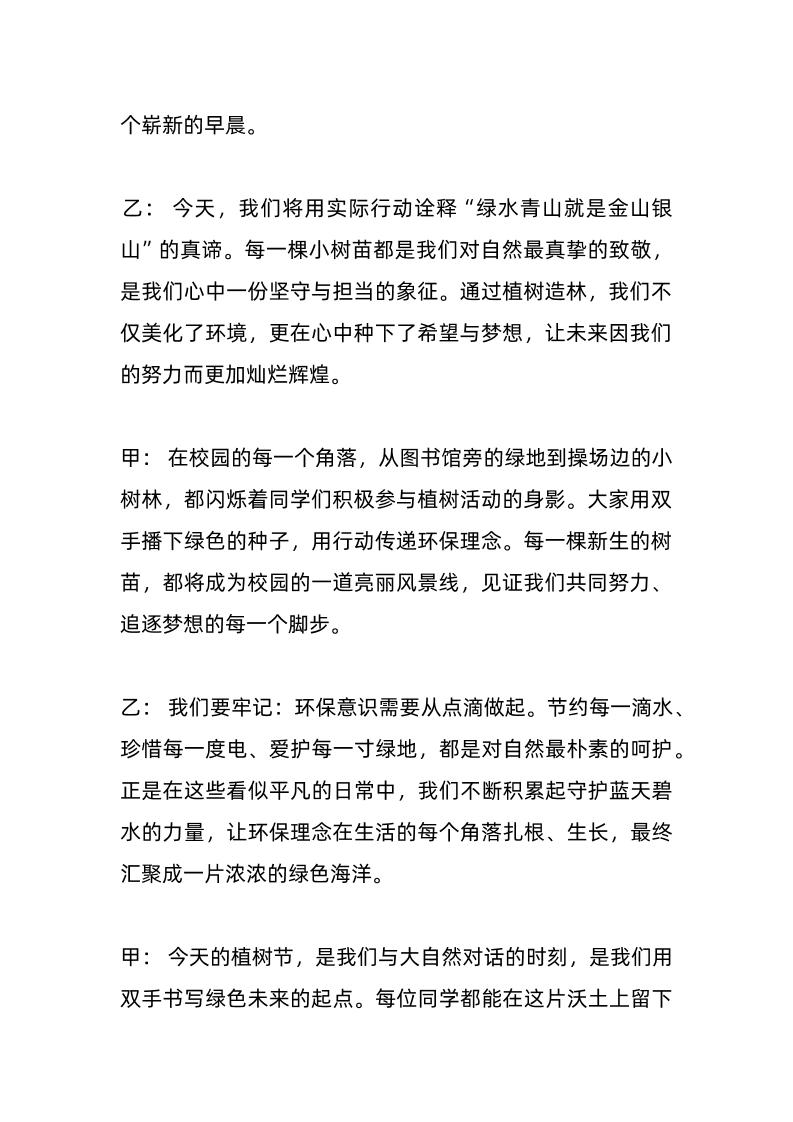 3-12植树节广播站广播稿——种下绿色希望,托起明天的梦子渊1年前发布关注私信03613 ——预览已结束,还剩3页未读——开通会员后可免费下载高清完整文档 3-12植树节广播站广播稿——种下绿色希望,托起明天的梦此内容为付费资源,请付费后查看¥18.8¥999普通会员免费超级会员免费立即购买您当前未登录!建议登陆后购买,可保存购买订单格式docx页数5 页大小14.25 KB付费资源© 版权声明文章版权归作者所有,未经允许请勿转载。THE END发言稿 喜欢就支持一下吧点赞13 分享QQ空间微博QQ好友海报分享复制链接收藏