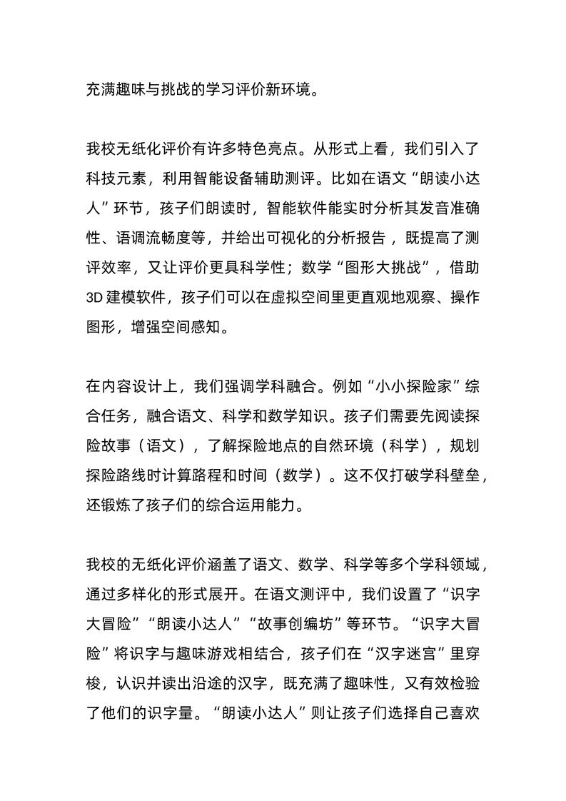 在全市小学教育研讨会上,校长经验交流发言:一二年级无纸化评价方面的探索与实践子渊12个月前发布关注私信0285 ——预览已结束,还剩3页未读——开通会员后可免费下载高清完整文档 在全市小学教育研讨会上,校长经验交流发言:一二年级无纸化评价方面的探索与实践此内容为付费资源,请付费后查看¥19.9¥999普通会员免费超级会员免费立即购买您当前未登录!建议登陆后购买,可保存购买订单格式docx页数5 页大小14.41 KB付费资源© 版权声明文章版权归作者所有,未经允许请勿转载。THE END发言稿 喜欢就支持一下吧点赞5 分享QQ空间微博QQ好友海报分享复制链接收藏
