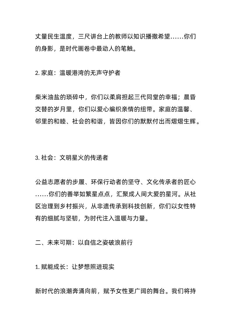 春风化雨润芳华,巾帼逐梦绽新篇——2025年“三八”国际妇女节致辞子渊11个月前发布关注私信0217 ——预览已结束,还剩3页未读——开通会员后可免费下载高清完整文档 春风化雨润芳华,巾帼逐梦绽新篇——2025年“三八”国际妇女节致辞此内容为付费资源,请付费后查看¥18.8¥999普通会员免费超级会员免费立即购买您当前未登录!建议登陆后购买,可保存购买订单格式docx页数5 页大小13.70 KB付费资源© 版权声明文章版权归作者所有,未经允许请勿转载。THE END发言稿 喜欢就支持一下吧点赞7 分享QQ空间微博QQ好友海报分享复制链接收藏