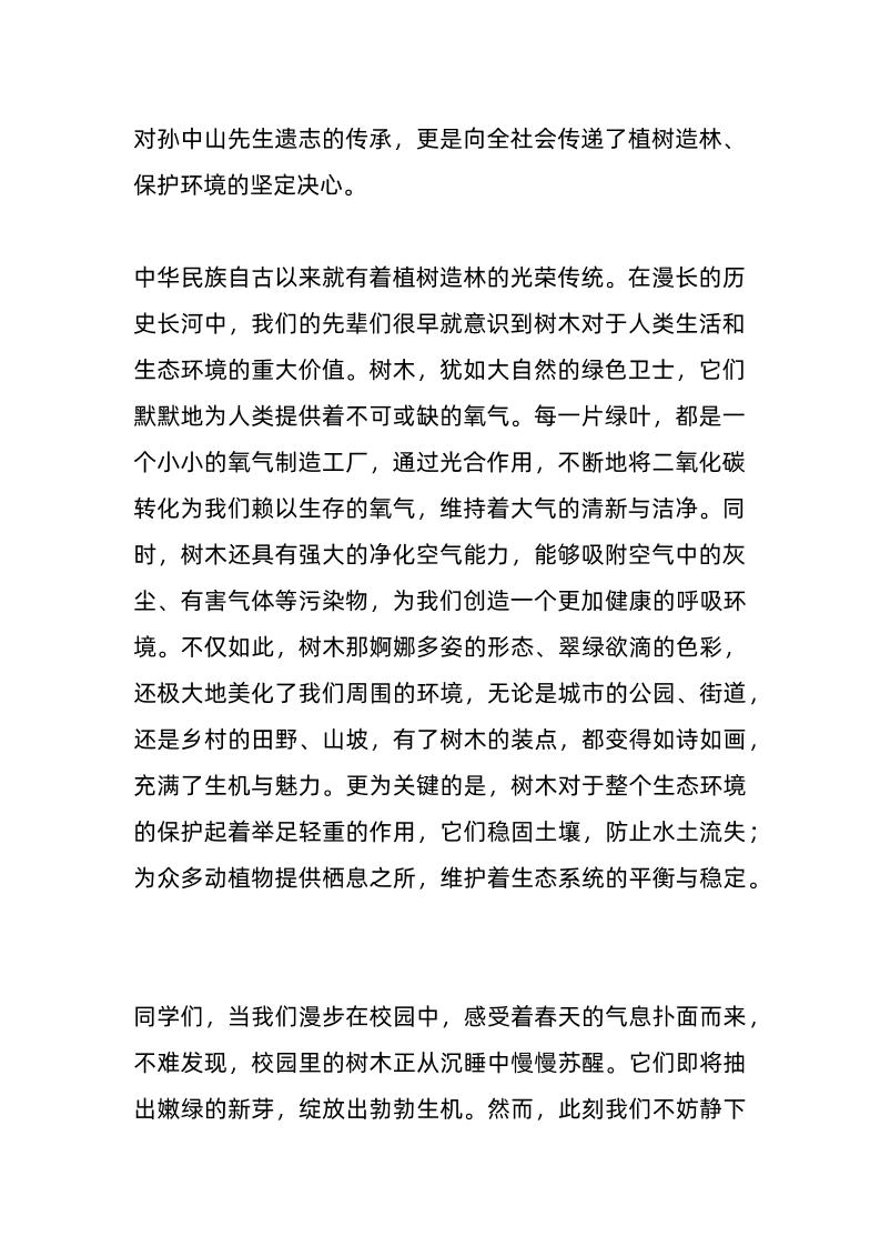 2025-3-12植树节,校长在国旗下讲话:守护校园每一抹绿,点亮祖国美好未来子渊11个月前发布关注私信0318 ——预览已结束,还剩2页未读——开通会员后可免费下载高清完整文档 2025-3-12植树节,校长在国旗下讲话:守护校园每一抹绿,点亮祖国美好未来此内容为付费资源,请付费后查看¥19.9¥999普通会员免费超级会员免费立即购买您当前未登录!建议登陆后购买,可保存购买订单格式docx页数4 页大小13.45 KB付费资源© 版权声明文章版权归作者所有,未经允许请勿转载。THE END国旗下讲话 喜欢就支持一下吧点赞8 分享QQ空间微博QQ好友海报分享复制链接收藏