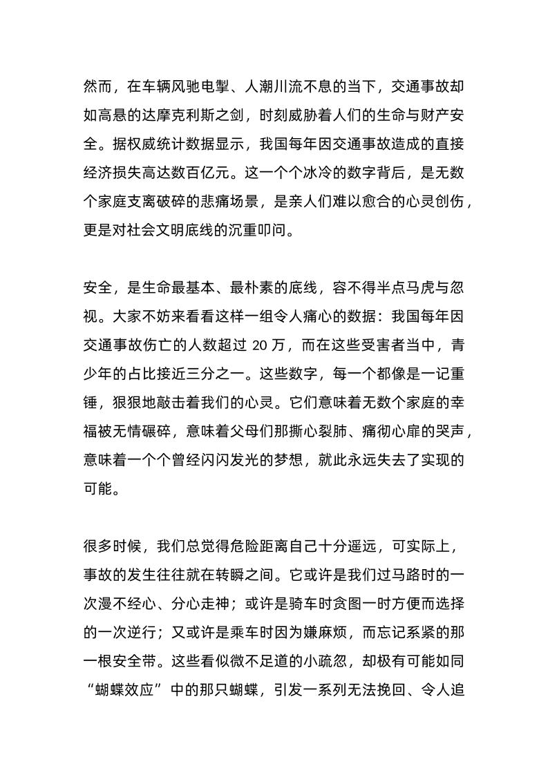 校长在国旗下讲话:别让交通规则成为生命的“催命符”子渊11个月前发布关注私信03214 ——预览已结束,还剩2页未读——开通会员后可免费下载高清完整文档 校长在国旗下讲话:别让交通规则成为生命的“催命符”此内容为付费资源,请付费后查看¥19.9¥999普通会员免费超级会员免费立即购买您当前未登录!建议登陆后购买,可保存购买订单格式docx页数4 页大小13.73 KB付费资源© 版权声明文章版权归作者所有,未经允许请勿转载。THE END国旗下讲话 喜欢就支持一下吧点赞14 分享QQ空间微博QQ好友海报分享复制链接收藏