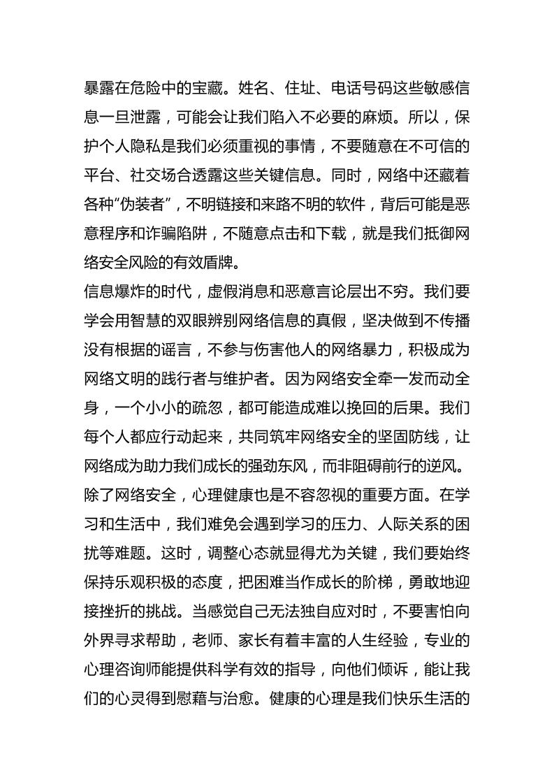 2025年春季第8周国旗下《安全伴我行,成长更无忧》的讲话稿子渊10个月前发布关注私信04913 ——预览已结束,还剩1页未读——开通会员后可免费下载高清完整文档 2025年春季第8周国旗下《安全伴我行,成长更无忧》的讲话稿此内容为付费资源,请付费后查看¥18.8¥999普通会员免费超级会员免费立即购买您当前未登录!建议登陆后购买,可保存购买订单格式docx页数3 页大小12.92 KB付费资源© 版权声明文章版权归作者所有,未经允许请勿转载。THE END国旗下讲话 喜欢就支持一下吧点赞13 分享QQ空间微博QQ好友海报分享复制链接收藏