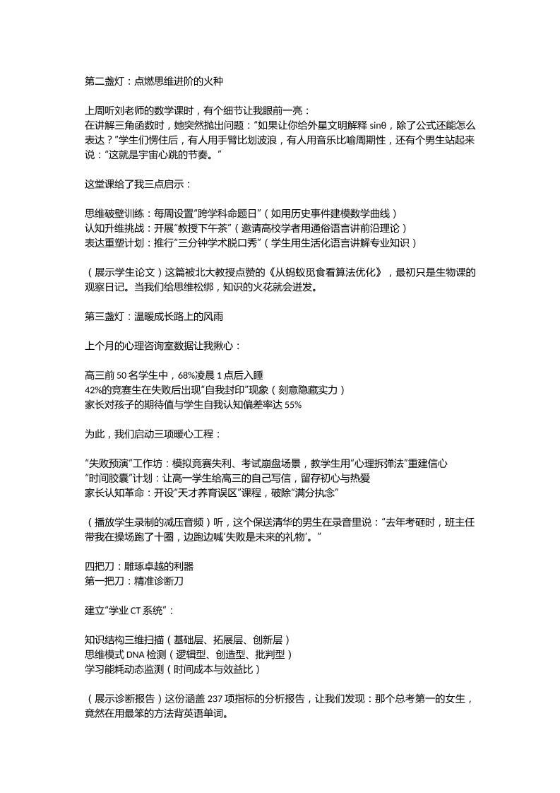 高中校长在高端尖子生培养推进会上的讲话:如何用三盏灯和四把刀照亮培优之路子渊10个月前发布关注私信0406 ——预览已结束,还剩2页未读——开通会员后可免费下载高清完整文档 高中校长在高端尖子生培养推进会上的讲话:如何用三盏灯和四把刀照亮培优之路此内容为付费资源,请付费后查看¥19.9¥999普通会员免费超级会员免费立即购买您当前未登录!建议登陆后购买,可保存购买订单格式docx页数4 页大小15.48 KB付费资源© 版权声明文章版权归作者所有,未经允许请勿转载。THE END发言稿 喜欢就支持一下吧点赞6 分享QQ空间微博QQ好友海报分享复制链接收藏