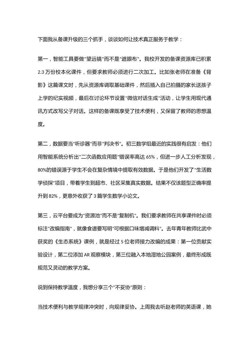校长在教育教学研讨会上讲话:信息化2.0时代的教育坚守——技术赋能下的备课升级与教学温度保持子渊10个月前发布关注私信03911 ——预览已结束,还剩2页未读——开通会员后可免费下载高清完整文档 校长在教育教学研讨会上讲话:信息化2.0时代的教育坚守——技术赋能下的备课升级与教学温度保持此内容为付费资源,请付费后查看¥18.8¥999普通会员免费超级会员免费立即购买您当前未登录!建议登陆后购买,可保存购买订单格式docx页数4 页大小14.11 KB付费资源© 版权声明文章版权归作者所有,未经允许请勿转载。THE END发言稿 喜欢就支持一下吧点赞11 分享QQ空间微博QQ好友海报分享复制链接收藏