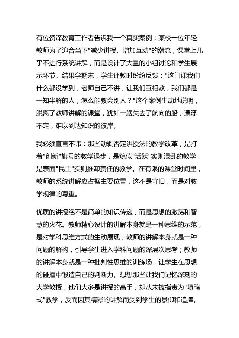 校长岗位思考:为什么说轻视讲授教学法是最大的教育灾难?子渊10个月前发布关注私信04711 ——预览已结束,还剩1页未读——开通会员后可免费下载高清完整文档 校长岗位思考:为什么说轻视讲授教学法是最大的教育灾难?此内容为付费资源,请付费后查看¥18.8¥999普通会员免费超级会员免费立即购买您当前未登录!建议登陆后购买,可保存购买订单格式docx页数3 页大小12.59 KB付费资源© 版权声明文章版权归作者所有,未经允许请勿转载。THE END发言稿 喜欢就支持一下吧点赞11 分享QQ空间微博QQ好友海报分享复制链接收藏