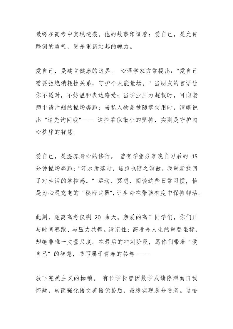 525心理健康日,校长在国旗下讲话:爱自己,是人生最深刻的修行,也是逐梦路上最坚实的铠甲子渊9个月前发布关注私信0327 ——预览已结束,还剩2页未读——开通会员后可免费下载高清完整文档 525心理健康日,校长在国旗下讲话:爱自己,是人生最深刻的修行,也是逐梦路上最坚实的铠甲此内容为付费资源,请付费后查看¥18.8¥999普通会员免费超级会员免费立即购买您当前未登录!建议登陆后购买,可保存购买订单格式docx页数4 页大小13.65 KB付费资源© 版权声明文章版权归作者所有,未经允许请勿转载。THE END国旗下讲话 喜欢就支持一下吧点赞7 分享QQ空间微博QQ好友海报分享复制链接收藏