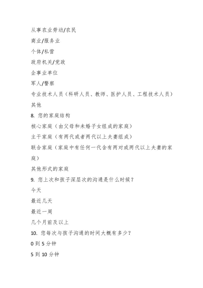 亲子沟通调查问卷(家长版)子渊6个月前发布关注私信03912 ——预览已结束,还剩5页未读——开通会员后可免费下载高清完整文档 亲子沟通调查问卷(家长版)此内容为付费资源,请付费后查看¥19.9¥999普通会员免费超级会员免费立即购买您当前未登录!建议登陆后购买,可保存购买订单格式docx页数7 页大小13.74 KB付费资源© 版权声明文章版权归作者所有,未经允许请勿转载。THE END管理相关 喜欢就支持一下吧点赞12 分享QQ空间微博QQ好友海报分享复制链接收藏