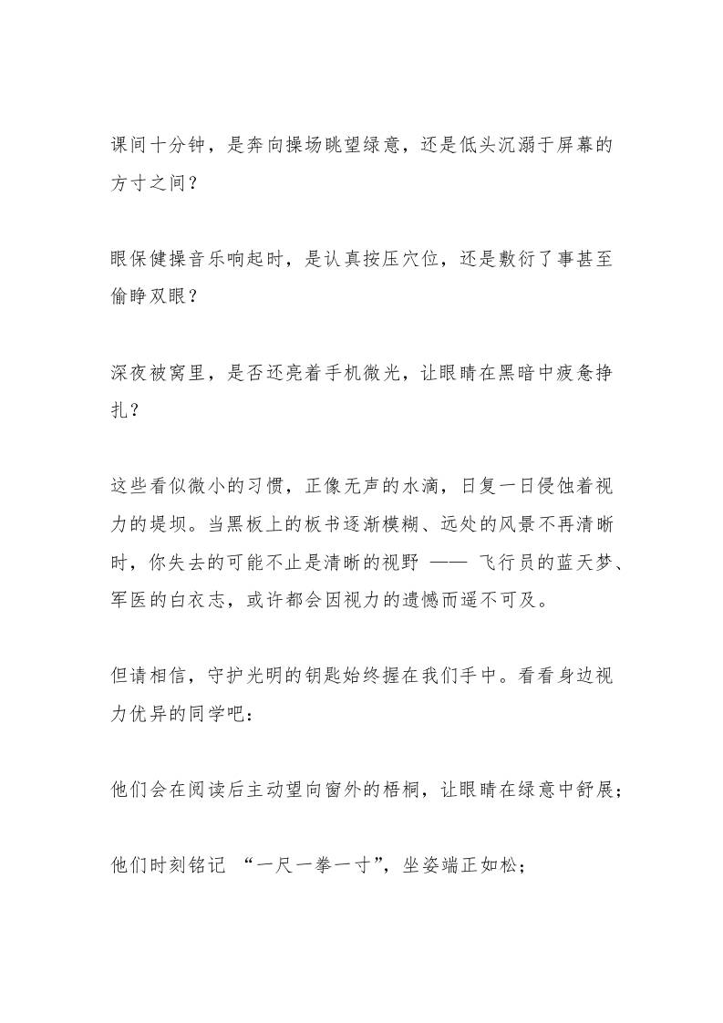 全国爱眼日,校长在国旗下讲话:守护心灵之窗子渊7个月前发布关注私信05014 ——预览已结束,还剩4页未读——开通会员后可免费下载高清完整文档 全国爱眼日,校长在国旗下讲话:守护心灵之窗此内容为付费资源,请付费后查看¥18.8¥999普通会员免费超级会员免费立即购买您当前未登录!建议登陆后购买,可保存购买订单格式docx页数6 页大小14.21 KB付费资源© 版权声明文章版权归作者所有,未经允许请勿转载。THE END国旗下讲话 喜欢就支持一下吧点赞14 分享QQ空间微博QQ好友海报分享复制链接收藏