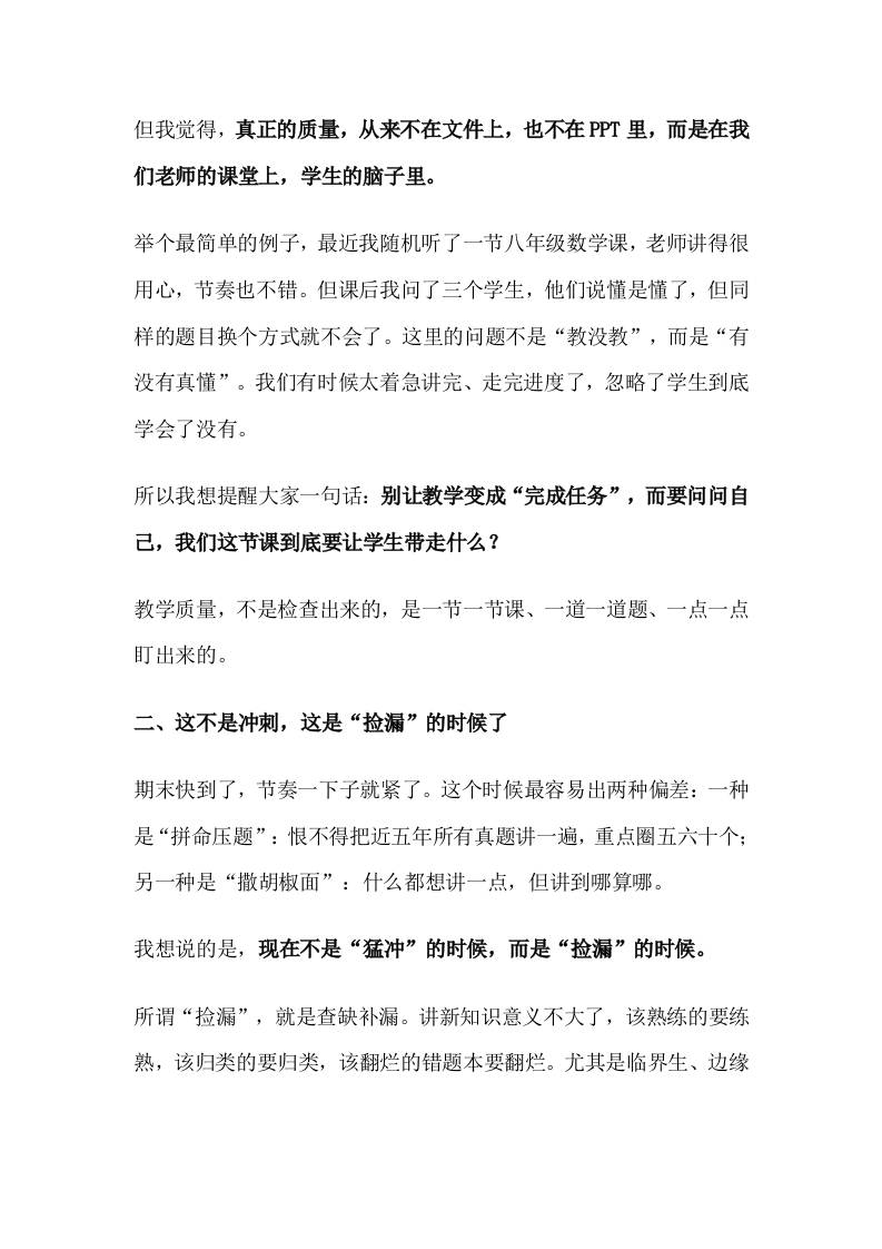 教学工作推进暨期末冲刺动员会上校长讲话:不让任何一个学生在最后掉队!子渊7个月前发布关注私信0249 ——预览已结束,还剩3页未读——开通会员后可免费下载高清完整文档 教学工作推进暨期末冲刺动员会上校长讲话:不让任何一个学生在最后掉队!此内容为付费资源,请付费后查看¥19.9¥999普通会员免费超级会员免费立即购买您当前未登录!建议登陆后购买,可保存购买订单格式docx页数5 页大小15.55 KB付费资源© 版权声明文章版权归作者所有,未经允许请勿转载。THE END发言稿 喜欢就支持一下吧点赞9 分享QQ空间微博QQ好友海报分享复制链接收藏
