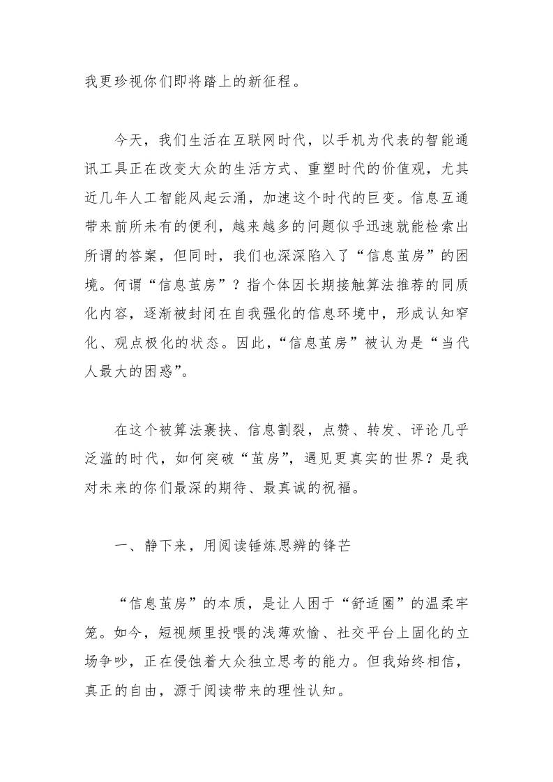 在中学2025届高三毕业典礼上的讲话:突破“茧房”,遇见更真实的世界子渊7个月前发布关注私信0436 ——预览已结束,还剩4页未读——开通会员后可免费下载高清完整文档 在中学2025届高三毕业典礼上的讲话:突破“茧房”,遇见更真实的世界此内容为付费资源,请付费后查看¥19.9¥999普通会员免费超级会员免费立即购买您当前未登录!建议登陆后购买,可保存购买订单格式docx页数6 页大小15.41 KB付费资源© 版权声明文章版权归作者所有,未经允许请勿转载。THE END发言稿 喜欢就支持一下吧点赞6 分享QQ空间微博QQ好友海报分享复制链接收藏
