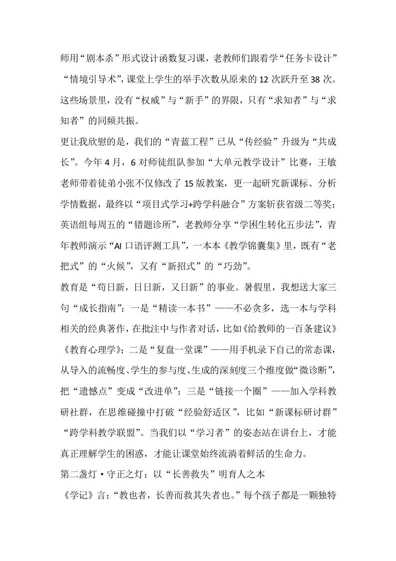 暑假前期末教师会校长讲话:从《学记》取三盏灯,照亮教育新征程子渊6个月前发布关注私信0245 ——预览已结束,还剩4页未读——开通会员后可免费下载高清完整文档 暑假前期末教师会校长讲话:从《学记》取三盏灯,照亮教育新征程此内容为付费资源,请付费后查看¥18.8¥999普通会员免费超级会员免费立即购买您当前未登录!建议登陆后购买,可保存购买订单格式docx页数6 页大小15.63 KB付费资源© 版权声明文章版权归作者所有,未经允许请勿转载。THE END发言稿 喜欢就支持一下吧点赞5 分享QQ空间微博QQ好友海报分享复制链接收藏