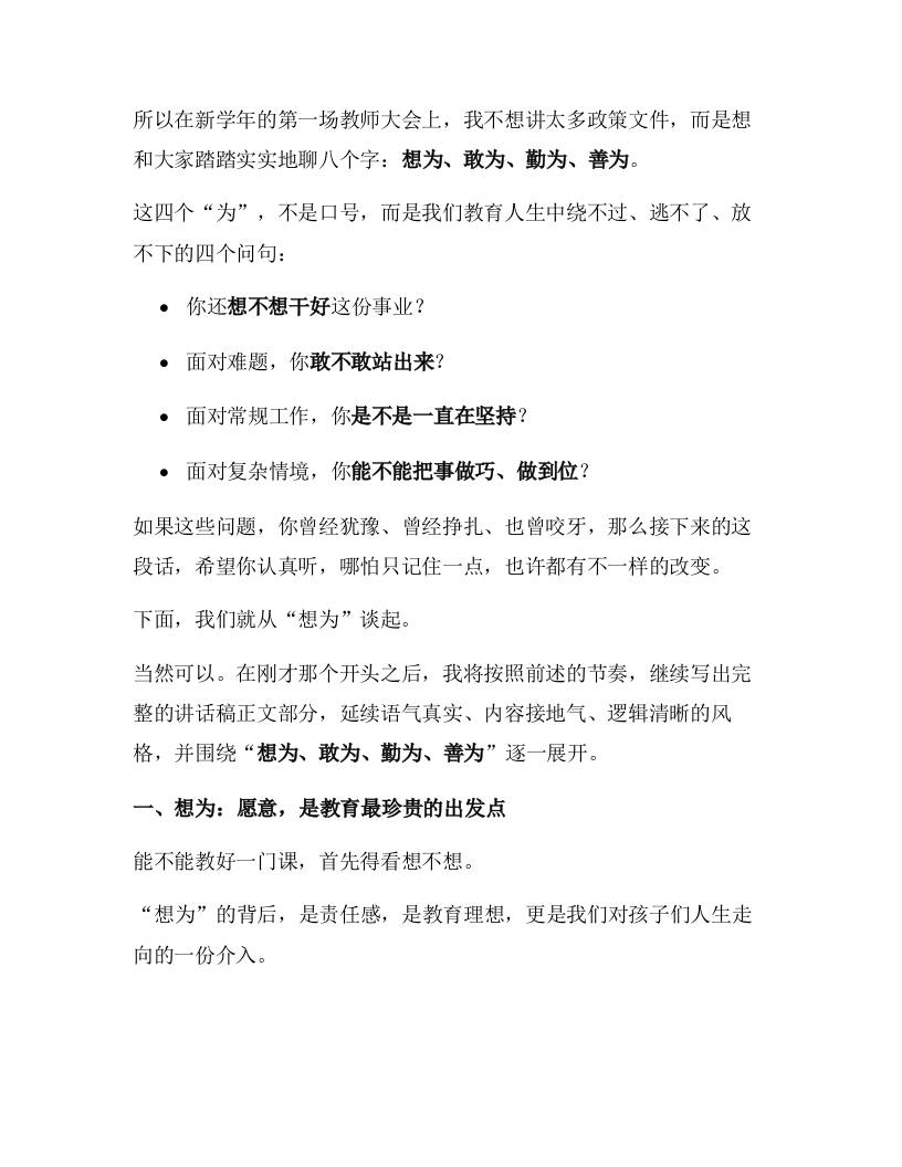 2025年秋季开学第一次全体教师大会上,校长讲话:以心立教,以行致远——做想为、敢为、勤为、善为的新时代教师!子渊6个月前发布关注私信02912 ——预览已结束,还剩6页未读——开通会员后可免费下载高清完整文档 2025年秋季开学第一次全体教师大会上,校长讲话:以心立教,以行致远——做想为、敢为、勤为、善为的新时代教师!此内容为付费资源,请付费后查看¥18.8¥999普通会员免费超级会员免费立即购买您当前未登录!建议登陆后购买,可保存购买订单格式docx页数8 页大小23.45 KB付费资源© 版权声明文章版权归作者所有,未经允许请勿转载。THE END发言稿 喜欢就支持一下吧点赞12 分享QQ空间微博QQ好友海报分享复制链接收藏