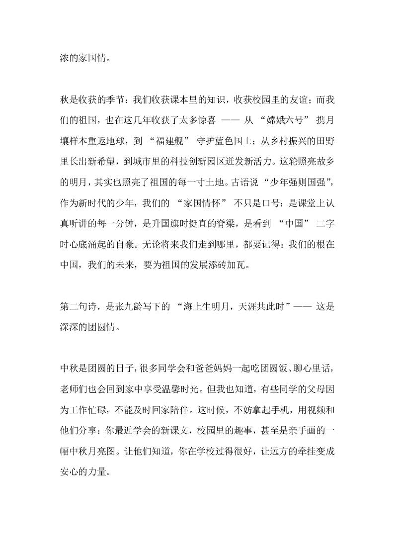 中秋国庆双节,校长在国旗下讲话:双节同辉映校园,家国同心向未来子渊5个月前发布关注私信0255 ——预览已结束,还剩2页未读——开通会员后可免费下载高清完整文档 中秋国庆双节,校长在国旗下讲话:双节同辉映校园,家国同心向未来此内容为付费资源,请付费后查看¥19.9¥999普通会员免费超级会员免费立即购买您当前未登录!建议登陆后购买,可保存购买订单格式docx页数4 页大小13.52 KB付费资源© 版权声明文章版权归作者所有,未经允许请勿转载。THE END国旗下讲话 喜欢就支持一下吧点赞5 分享QQ空间微博QQ好友海报分享复制链接收藏