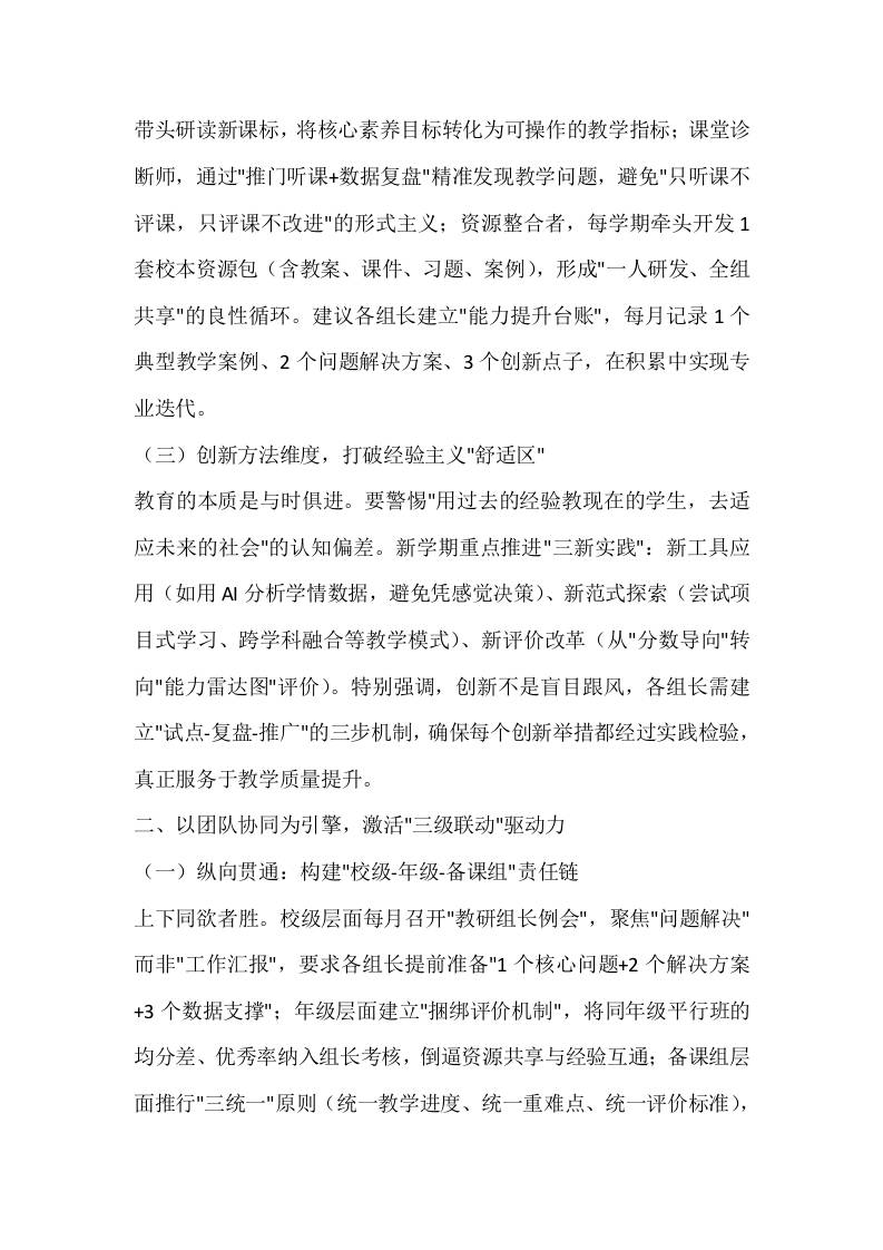 教研组长和备课组长会议上,校长讲话:3个维度筑牢质量根基,120%执行决胜新学期子渊5个月前发布关注私信0356 ——预览已结束,还剩3页未读——开通会员后可免费下载高清完整文档 教研组长和备课组长会议上,校长讲话:3个维度筑牢质量根基,120%执行决胜新学期此内容为付费资源,请付费后查看¥18.8¥999普通会员免费超级会员免费立即购买您当前未登录!建议登陆后购买,可保存购买订单格式docx页数5 页大小14.96 KB付费资源© 版权声明文章版权归作者所有,未经允许请勿转载。THE END发言稿 喜欢就支持一下吧点赞6 分享QQ空间微博QQ好友海报分享复制链接收藏