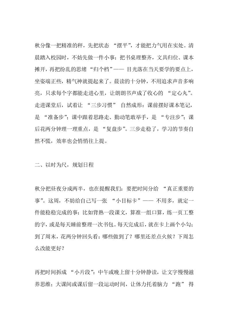 秋分节气,校长在国旗下讲话:秋分启“有度”,学行筑新章子渊5个月前发布关注私信0336 ——预览已结束,还剩2页未读——开通会员后可免费下载高清完整文档 秋分节气,校长在国旗下讲话:秋分启“有度”,学行筑新章此内容为付费资源,请付费后查看¥18.8¥999普通会员免费超级会员免费立即购买您当前未登录!建议登陆后购买,可保存购买订单格式docx页数4 页大小13.75 KB付费资源© 版权声明文章版权归作者所有,未经允许请勿转载。THE END国旗下讲话 喜欢就支持一下吧点赞6 分享QQ空间微博QQ好友海报分享复制链接收藏