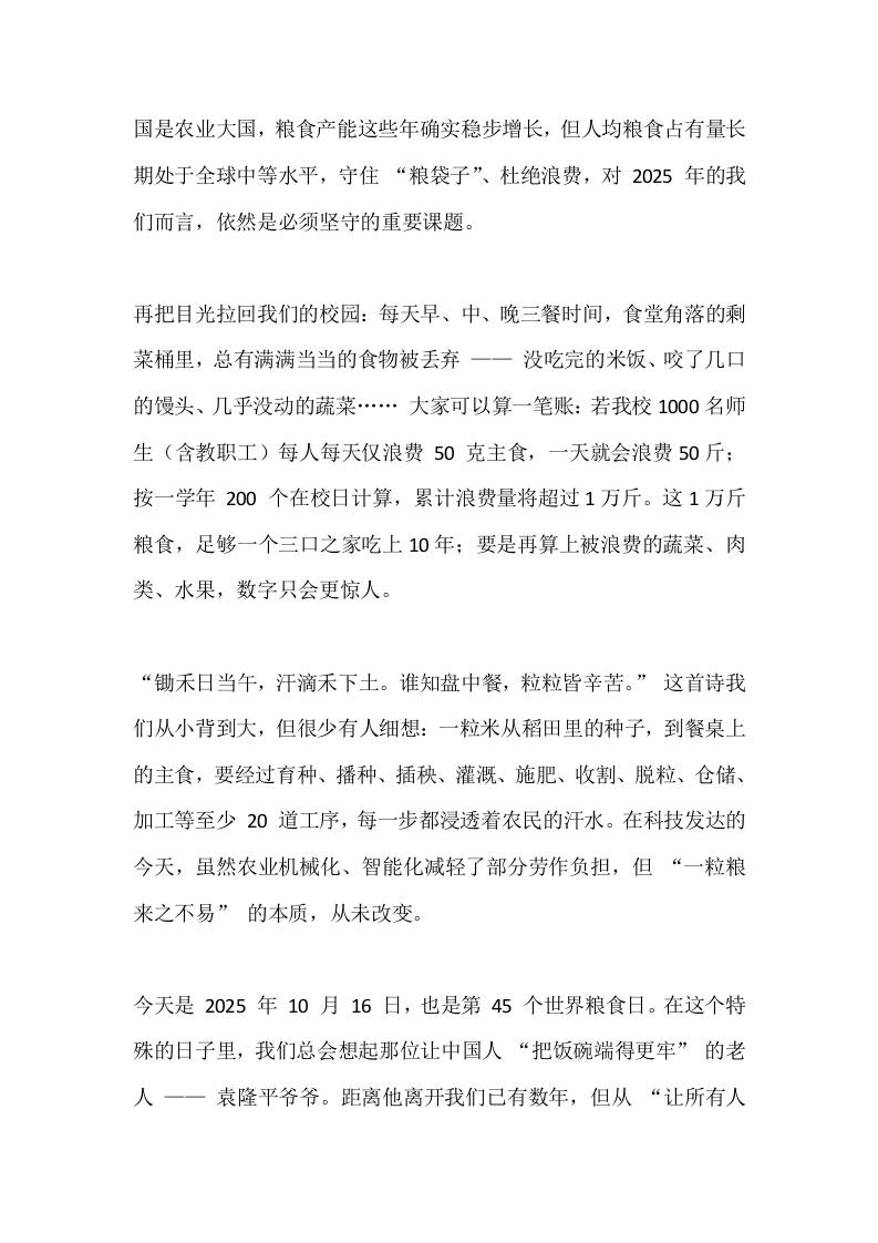 2025世界粮食日,校长在国旗下讲话:珍惜每一粒粮,传承伟人志子渊4个月前发布关注私信03611 ——预览已结束,还剩3页未读——开通会员后可免费下载高清完整文档 2025世界粮食日,校长在国旗下讲话:珍惜每一粒粮,传承伟人志此内容为付费资源,请付费后查看¥19.9¥999普通会员免费超级会员免费立即购买您当前未登录!建议登陆后购买,可保存购买订单格式docx页数5 页大小14.32 KB付费资源© 版权声明文章版权归作者所有,未经允许请勿转载。THE END国旗下讲话 喜欢就支持一下吧点赞11 分享QQ空间微博QQ好友海报分享复制链接收藏