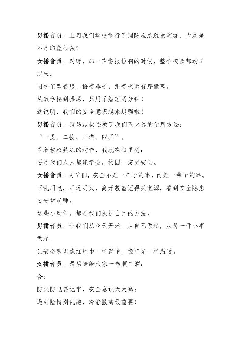“11·9全国消防日”红领巾广播稿——红领巾学消防,平安伴我成长子渊4个月前发布关注私信0245 ——预览已结束,还剩1页未读——开通会员后可免费下载高清完整文档 “11·9全国消防日”红领巾广播稿——红领巾学消防,平安伴我成长此内容为付费资源,请付费后查看¥19.9¥999普通会员免费超级会员免费立即购买您当前未登录!建议登陆后购买,可保存购买订单格式docx页数3 页大小131.77 KB付费资源© 版权声明文章版权归作者所有,未经允许请勿转载。THE END发言稿 喜欢就支持一下吧点赞5 分享QQ空间微博QQ好友海报分享复制链接收藏