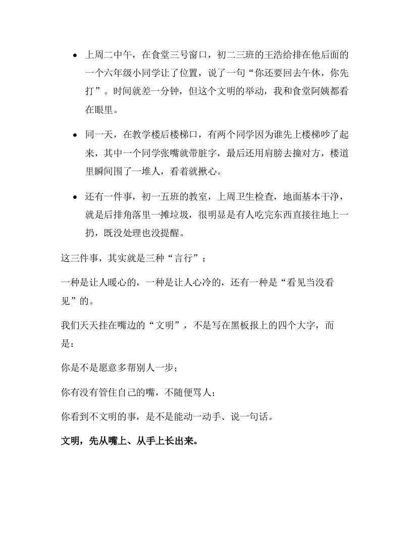 校长在国旗下讲话:让习惯为你撑腰——文明言行与自律人生的青春约定!子渊3个月前发布关注私信03610 ——预览已结束,还剩5页未读——开通会员后可免费下载高清完整文档 校长在国旗下讲话:让习惯为你撑腰——文明言行与自律人生的青春约定!此内容为付费资源,请付费后查看¥19.9¥999普通会员免费超级会员免费立即购买您当前未登录!建议登陆后购买,可保存购买订单格式docx页数7 页大小21.01 KB付费资源© 版权声明文章版权归作者所有,未经允许请勿转载。THE END国旗下讲话 喜欢就支持一下吧点赞10 分享QQ空间微博QQ好友海报分享复制链接收藏