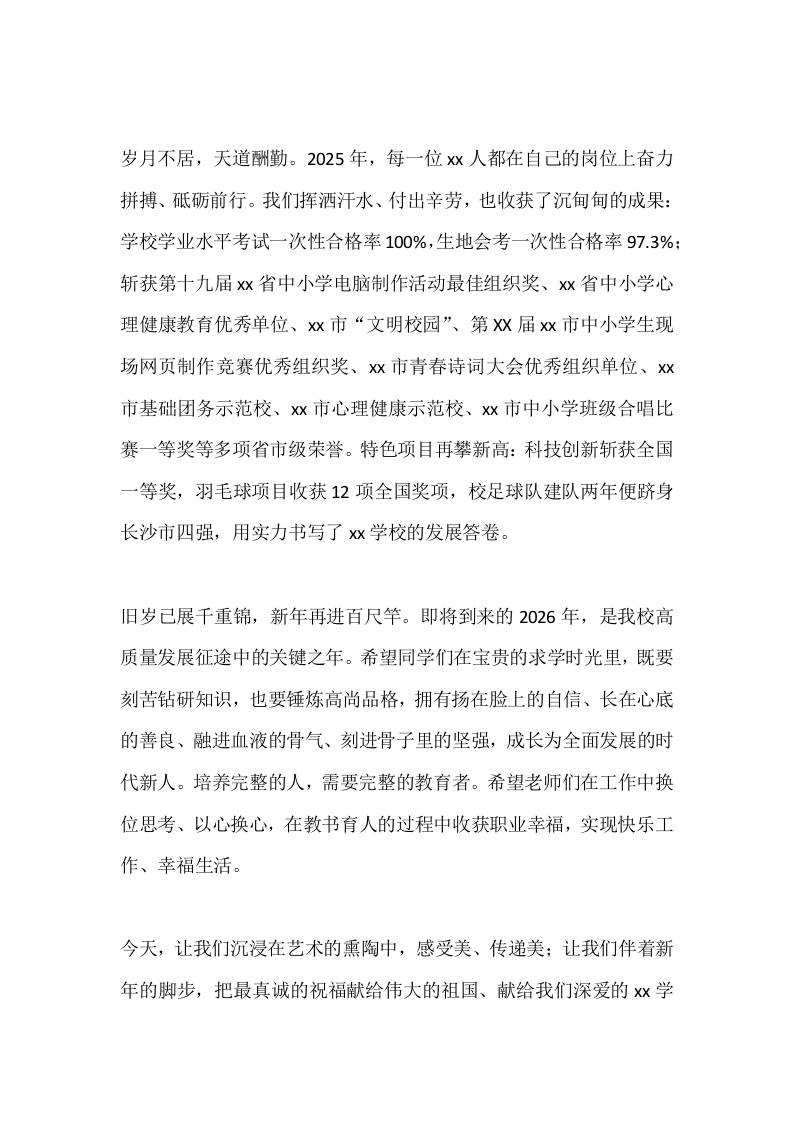 校园艺术节闭幕式暨2026元旦文艺汇演校长致辞:艺彩绽芳华,逐梦启新程子渊46天前发布关注私信04511 ——预览已结束,还剩1页未读——开通会员后可免费下载高清完整文档 校园艺术节闭幕式暨2026元旦文艺汇演校长致辞:艺彩绽芳华,逐梦启新程此内容为付费资源,请付费后查看¥19.9¥999普通会员免费超级会员免费立即购买您当前未登录!建议登陆后购买,可保存购买订单格式docx页数3 页大小12.22 KB付费资源© 版权声明文章版权归作者所有,未经允许请勿转载。THE END管理相关 喜欢就支持一下吧点赞11 分享QQ空间微博QQ好友海报分享复制链接收藏