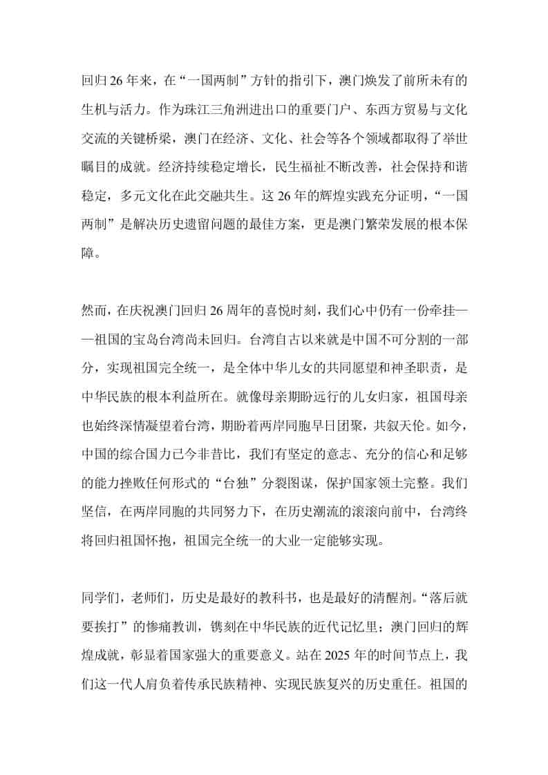 12.20澳门回归日,校长在国旗下:庆澳门回归,赴时代新程子渊39天前发布关注私信0375 ——预览已结束,还剩1页未读——开通会员后可免费下载高清完整文档 12.20澳门回归日,校长在国旗下:庆澳门回归,赴时代新程此内容为付费资源,请付费后查看¥18.8¥999普通会员免费超级会员免费立即购买您当前未登录!建议登陆后购买,可保存购买订单格式doc页数3 页大小13.00 KB付费资源© 版权声明文章版权归作者所有,未经允许请勿转载。THE END国旗下讲话 喜欢就支持一下吧点赞5 分享QQ空间微博QQ好友海报分享复制链接收藏