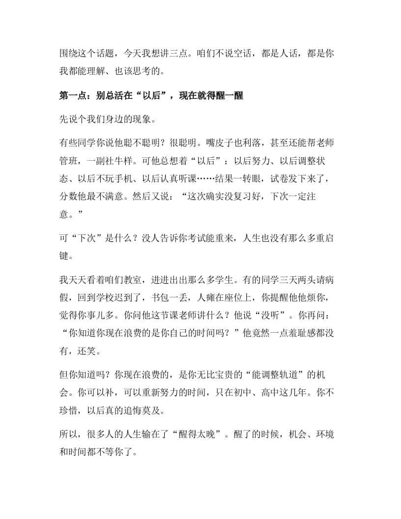 期末动员大会上,校长讲话:别再靠“以后我一定行”骗自己了——这场讲话,句句说进中学生的心里!子渊42天前发布关注私信02810 ——预览已结束,还剩4页未读——开通会员后可免费下载高清完整文档 期末动员大会上,校长讲话:别再靠“以后我一定行”骗自己了——这场讲话,句句说进中学生的心里!此内容为付费资源,请付费后查看¥18.8¥999普通会员免费超级会员免费立即购买您当前未登录!建议登陆后购买,可保存购买订单格式docx页数6 页大小19.38 KB付费资源© 版权声明文章版权归作者所有,未经允许请勿转载。THE END发言稿 喜欢就支持一下吧点赞10 分享QQ空间微博QQ好友海报分享复制链接收藏