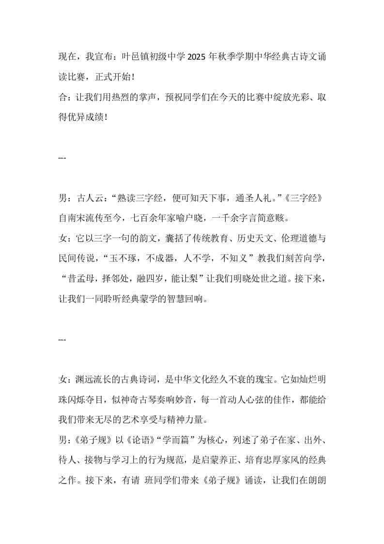 XX学校中华经典古诗文诵读比赛主持辞子渊22天前发布关注私信0215 ——预览已结束,还剩3页未读——开通会员后可免费下载高清完整文档 XX学校中华经典古诗文诵读比赛主持辞此内容为付费资源,请付费后查看¥19.9¥999普通会员免费超级会员免费立即购买您当前未登录!建议登陆后购买,可保存购买订单格式docx页数5 页大小14.14 KB付费资源© 版权声明文章版权归作者所有,未经允许请勿转载。THE END管理相关 喜欢就支持一下吧点赞5 分享QQ空间微博QQ好友海报分享复制链接收藏