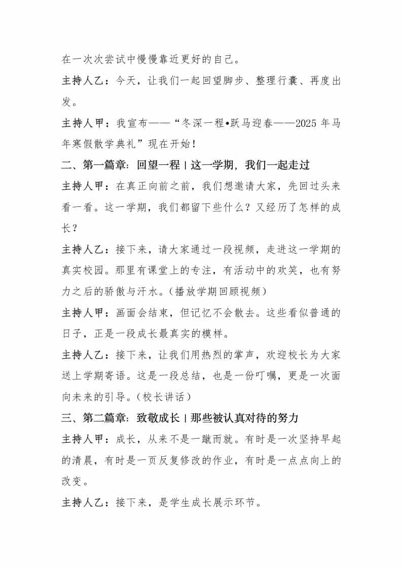 冬深一程跃马迎春,一页已读一章将启——2026马年寒假散学典礼主持词子渊22天前发布关注私信04110 ——预览已结束,还剩3页未读——开通会员后可免费下载高清完整文档 冬深一程跃马迎春,一页已读一章将启——2026马年寒假散学典礼主持词此内容为付费资源,请付费后查看¥18.8¥999普通会员免费超级会员免费立即购买您当前未登录!建议登陆后购买,可保存购买订单格式docx页数5 页大小388.15 KB付费资源© 版权声明文章版权归作者所有,未经允许请勿转载。THE END管理相关 喜欢就支持一下吧点赞10 分享QQ空间微博QQ好友海报分享复制链接收藏