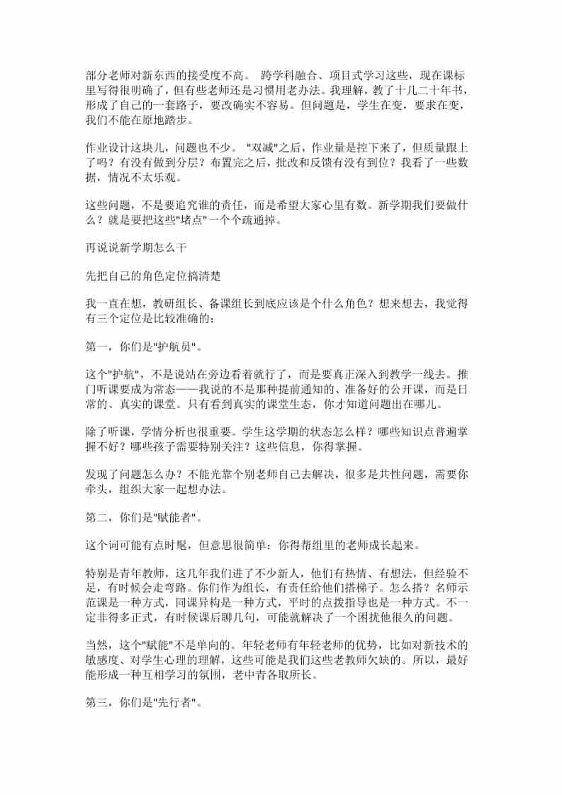 2026春季新学期,在教研组长、备课组长会议上,教学副校长巧用电影《飞驰人生3》直击人心子渊9小时前发布关注私信0258 ——预览已结束,还剩4页未读——开通会员后可免费下载高清完整文档 2026春季新学期,在教研组长、备课组长会议上,教学副校长巧用电影《飞驰人生3》直击人心此内容为付费资源,请付费后查看¥19.9¥999普通会员免费超级会员免费立即购买您当前未登录!建议登陆后购买,可保存购买订单格式docx页数6 页大小18.23 KB付费资源© 版权声明文章版权归作者所有,未经允许请勿转载。THE END管理相关 喜欢就支持一下吧点赞8 分享QQ空间微博QQ好友海报分享复制链接收藏
