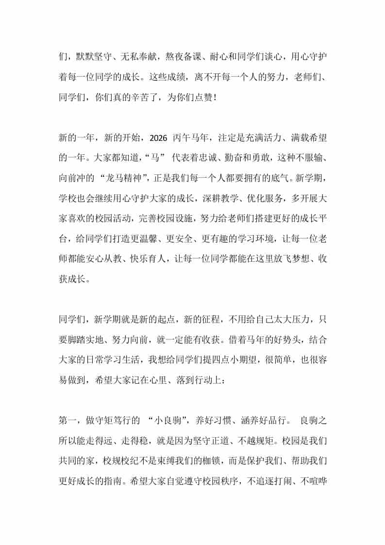 2026春季开学典礼,校长讲话:新学期,乘马年雄风追梦去子渊前天发布关注私信0375 ——预览已结束,还剩3页未读——开通会员后可免费下载高清完整文档 2026春季开学典礼,校长讲话:新学期,乘马年雄风追梦去此内容为付费资源,请付费后查看¥19.9¥999普通会员免费超级会员免费立即购买您当前未登录!建议登陆后购买,可保存购买订单格式docx页数5 页大小14.28 KB付费资源© 版权声明文章版权归作者所有,未经允许请勿转载。THE END发言稿 喜欢就支持一下吧点赞5 分享QQ空间微博QQ好友海报分享复制链接收藏