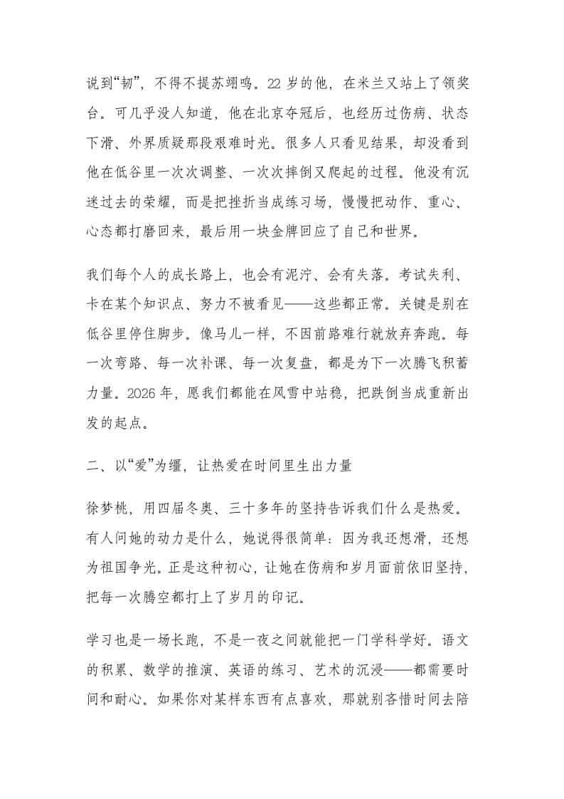 2026春季新学期开学典礼,校长讲话:米兰冬奥圣火虽熄,新学期激情点燃子渊8小时前发布关注私信0358 ——预览已结束,还剩2页未读——开通会员后可免费下载高清完整文档 2026春季新学期开学典礼,校长讲话:米兰冬奥圣火虽熄,新学期激情点燃此内容为付费资源,请付费后查看¥18.8¥999普通会员免费超级会员免费立即购买您当前未登录!建议登陆后购买,可保存购买订单格式docx页数4 页大小13.82 KB付费资源© 版权声明文章版权归作者所有,未经允许请勿转载。THE END发言稿 喜欢就支持一下吧点赞8 分享QQ空间微博QQ好友海报分享复制链接收藏