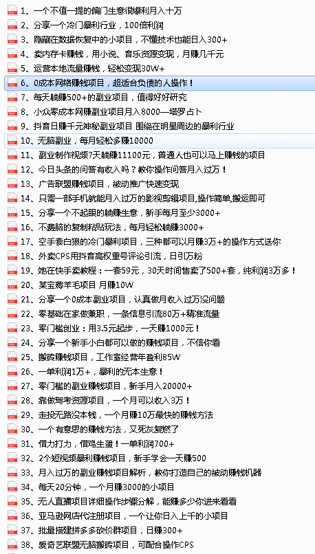 从这些项目的展示图片(放图片的地方)就能看出来,每一个好像都很有搞头。不管你是想利用业余时间小赚一笔,还是打算全身心投入发展副业,这里面肯定有适合你的。想象一下,要是咱能从这 108 个项目里找到一个适合自己的,那以后的生活质量不得蹭蹭往上涨嘛!